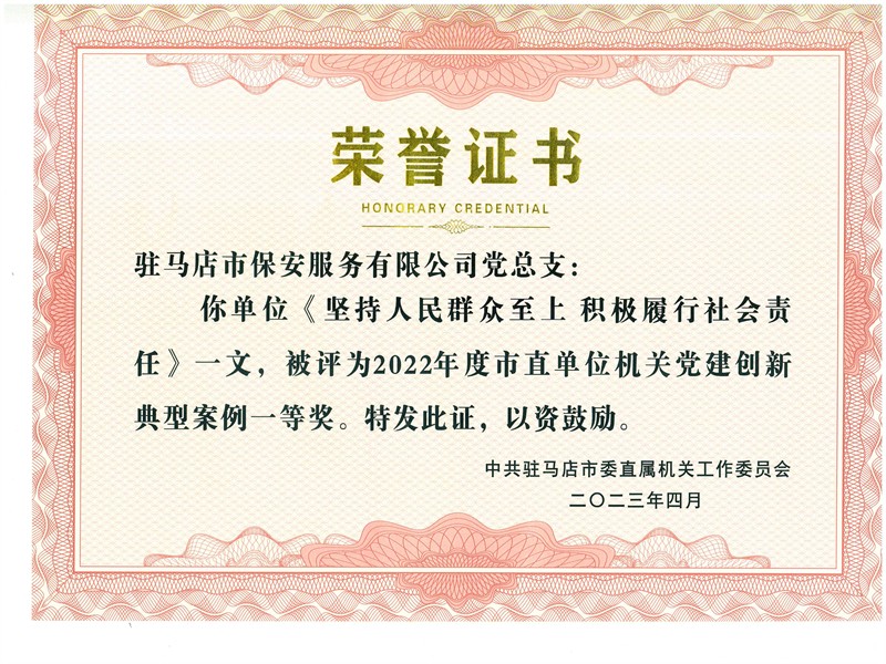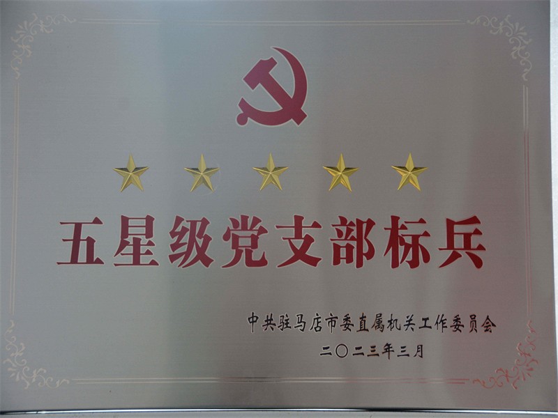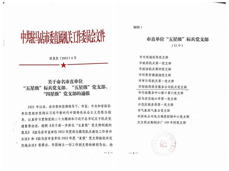 2023年4月25日,駐馬店市保安服務(wù)有限公司機(jī)關(guān)黨支部被駐馬店市直屬機(jī)關(guān)工作委員會表彰為“五星級”標(biāo)兵黨支部。